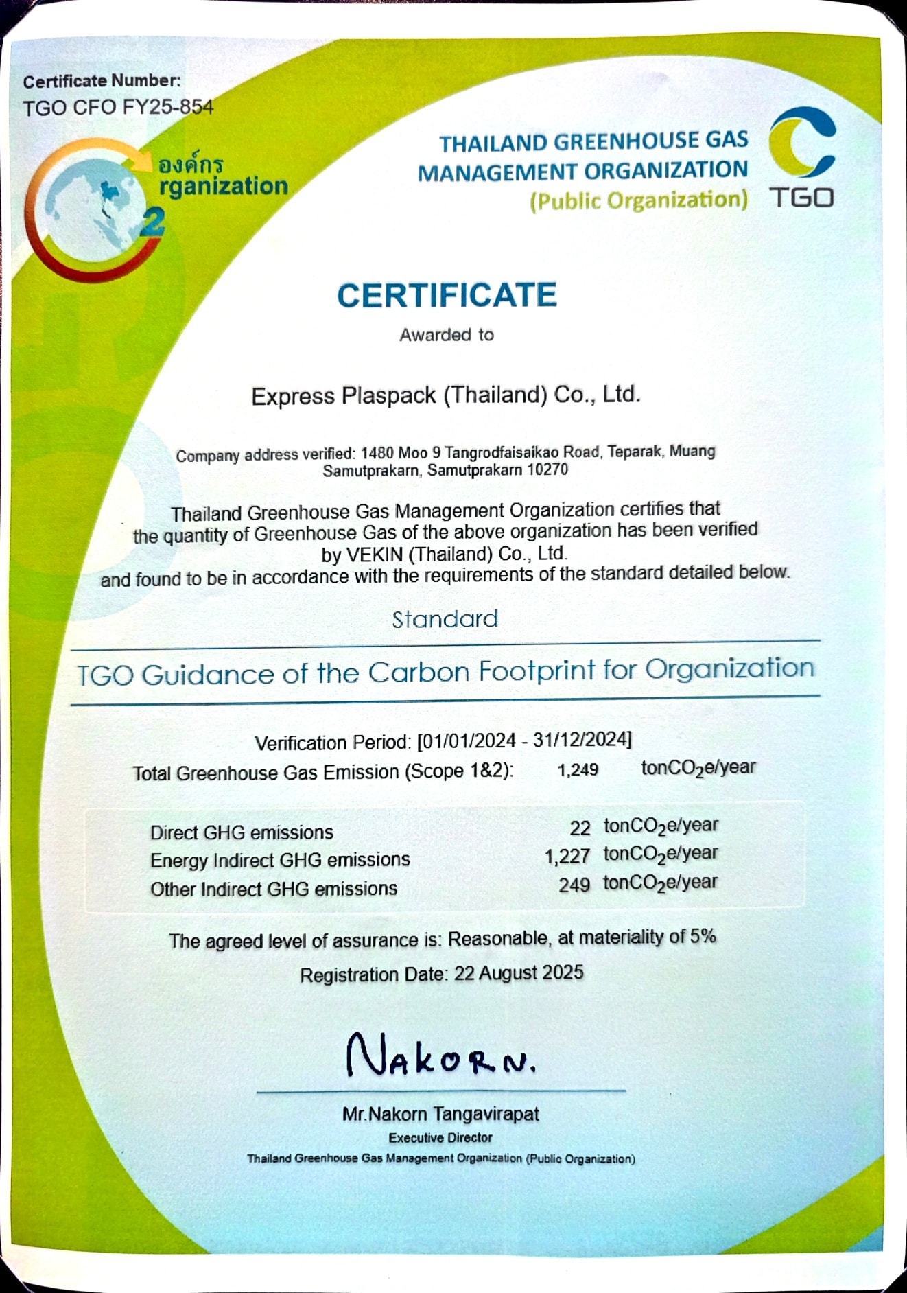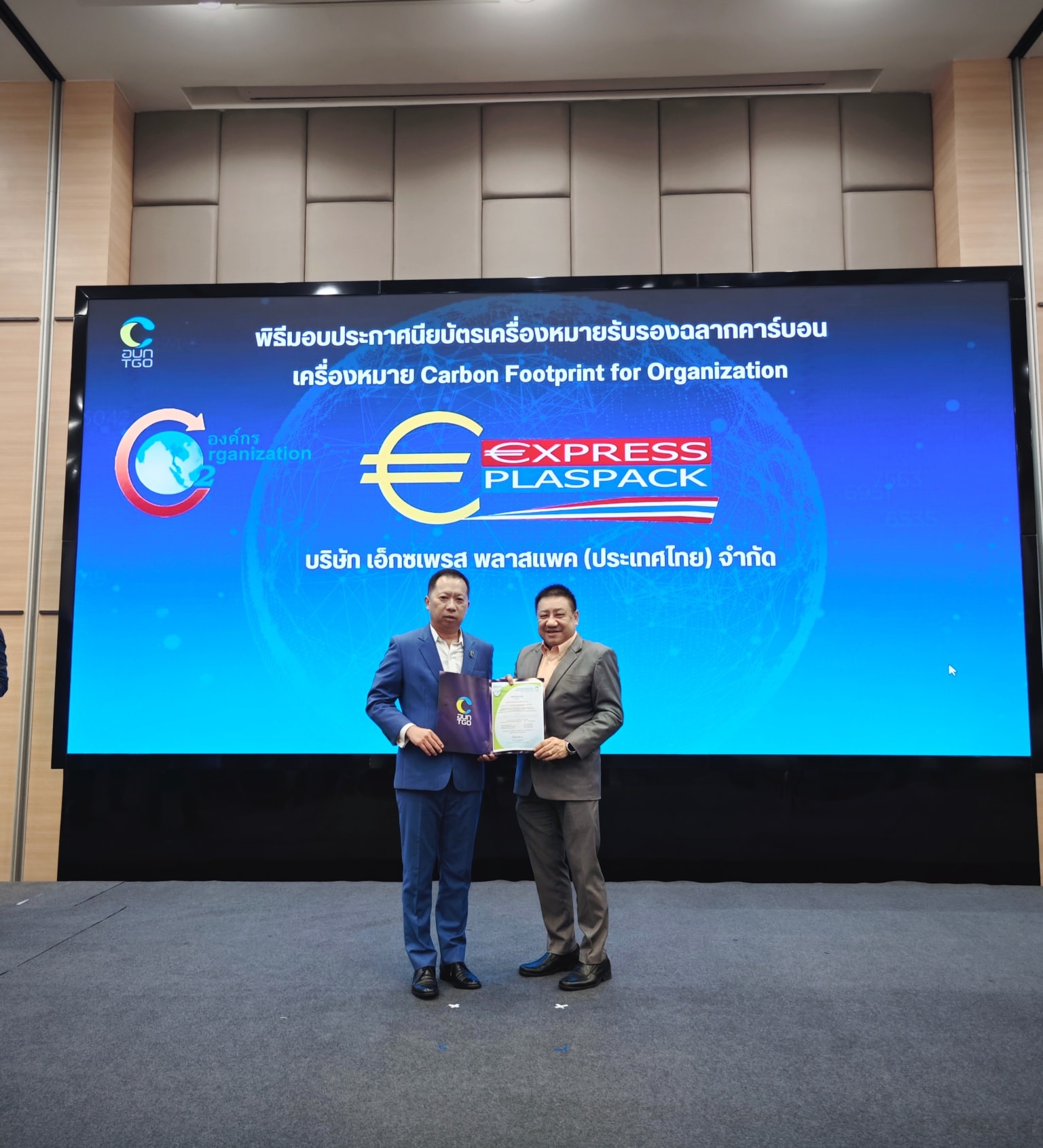 บริษัท เอ็กซเพรส พลาสแพค (ประเทศไทย) จำกัด มีความภูมิใจที่จะประกาศว่าเราได้รับ “ประกาศนียบัตรเครื่องหมายคาร์บอนฟุตพริ้นท์ขององค์กร — Carbon Footprint for Organization (CFO)” จากองค์การบริหารจัดการก๊าซเรือนกระจก (องค์การมหาชน) หรือ TGO